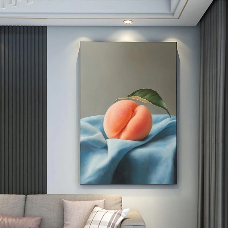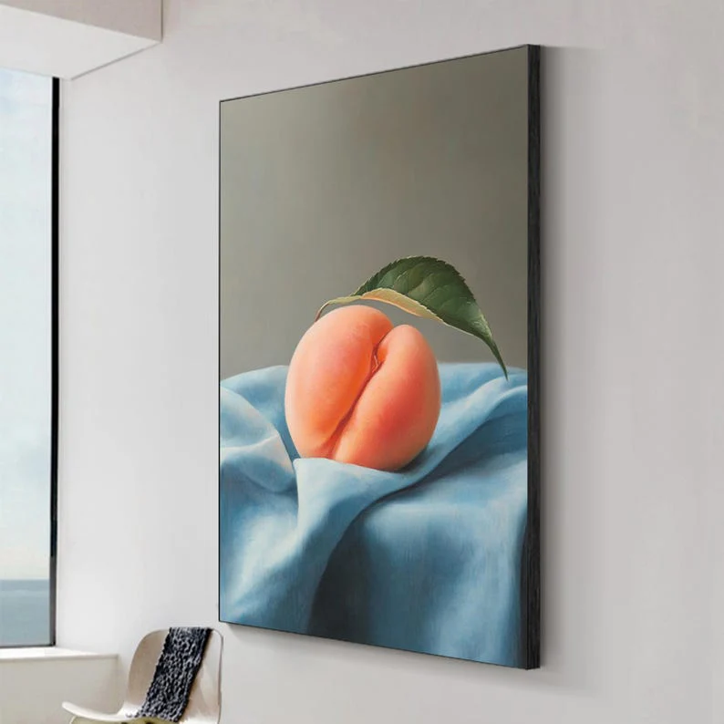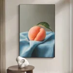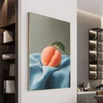 You can almost smell the sweetness of the peach as it sits perfectly on the blue, silky fabric. It’s a moment of calm, a stunning still life painting that feels full of warmth, sunlight, and the simple beauty of nature.