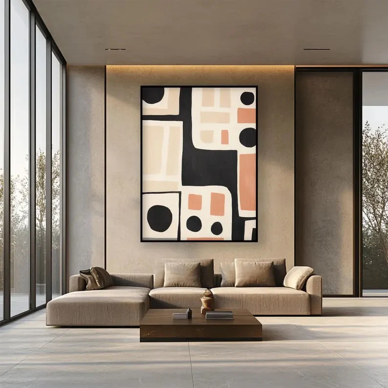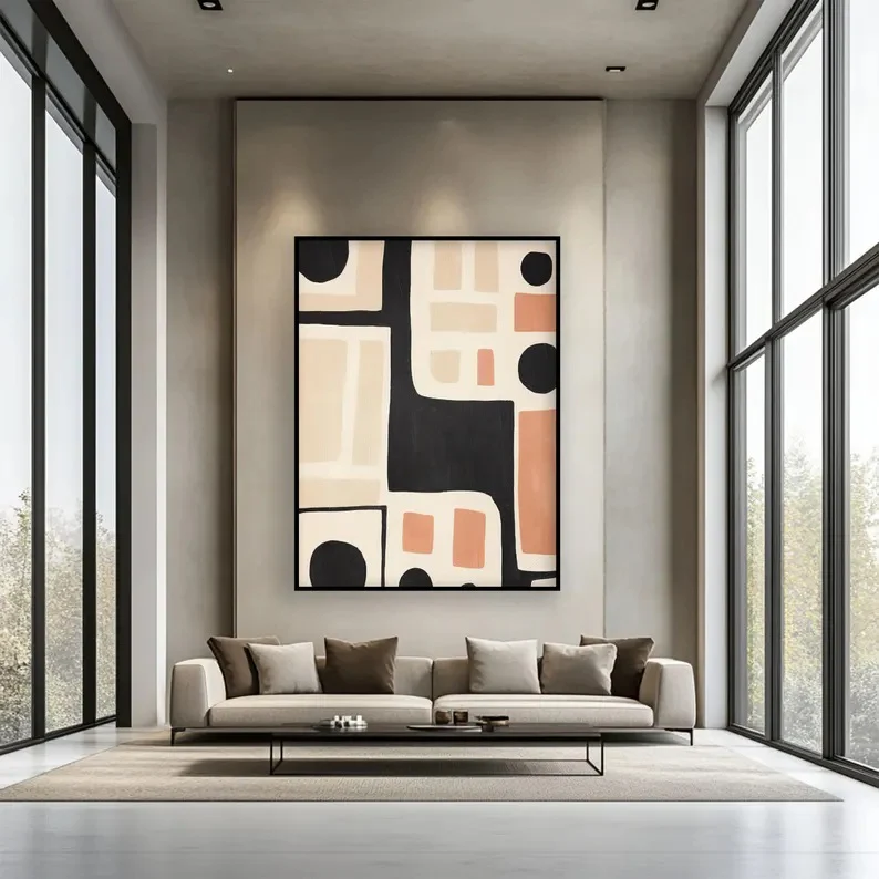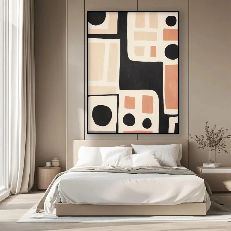 Shapes and colors appear like signals coming and going. The soft beige colors and warm clay tones feel calm, while the deep black shapes add pauses, like moments of silence between sound. It is quiet, modern, and steady. A piece that brings peace to a room, like late night radio playing softly while the world sleeps.