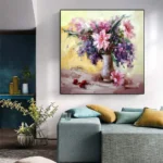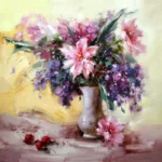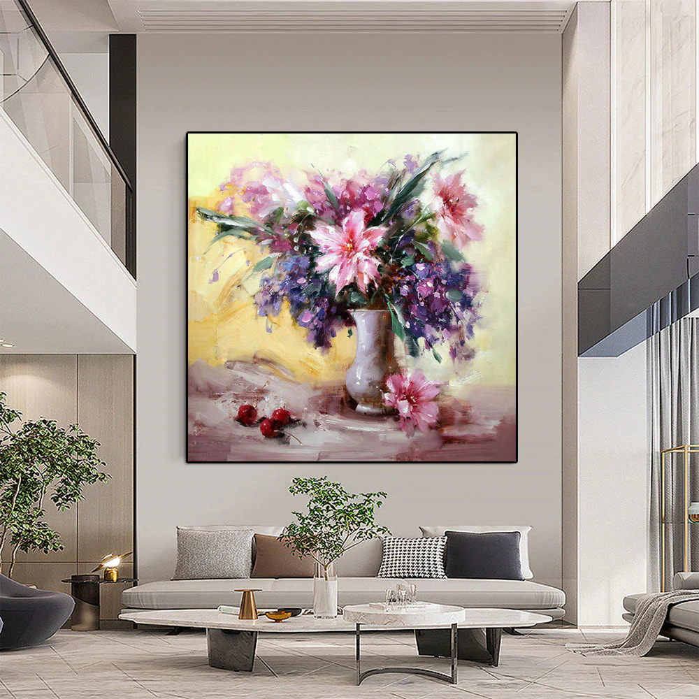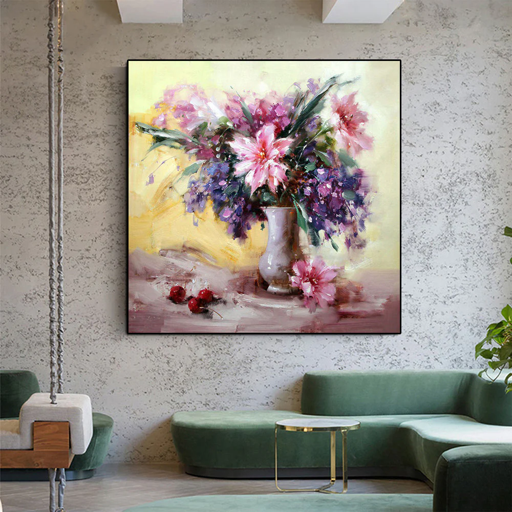 ‘Romantic Still Life’ is a celebration of love and beauty. The soft pastels and vivid blossoms radiate charm, while the cherries add a playful touch. It’s a timeless piece that turns any space into a haven of warmth.
