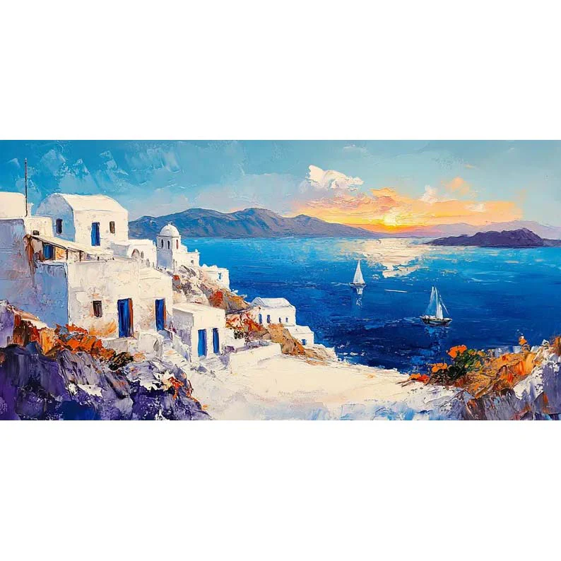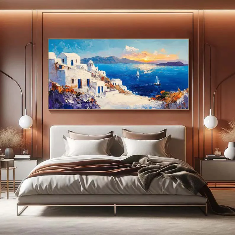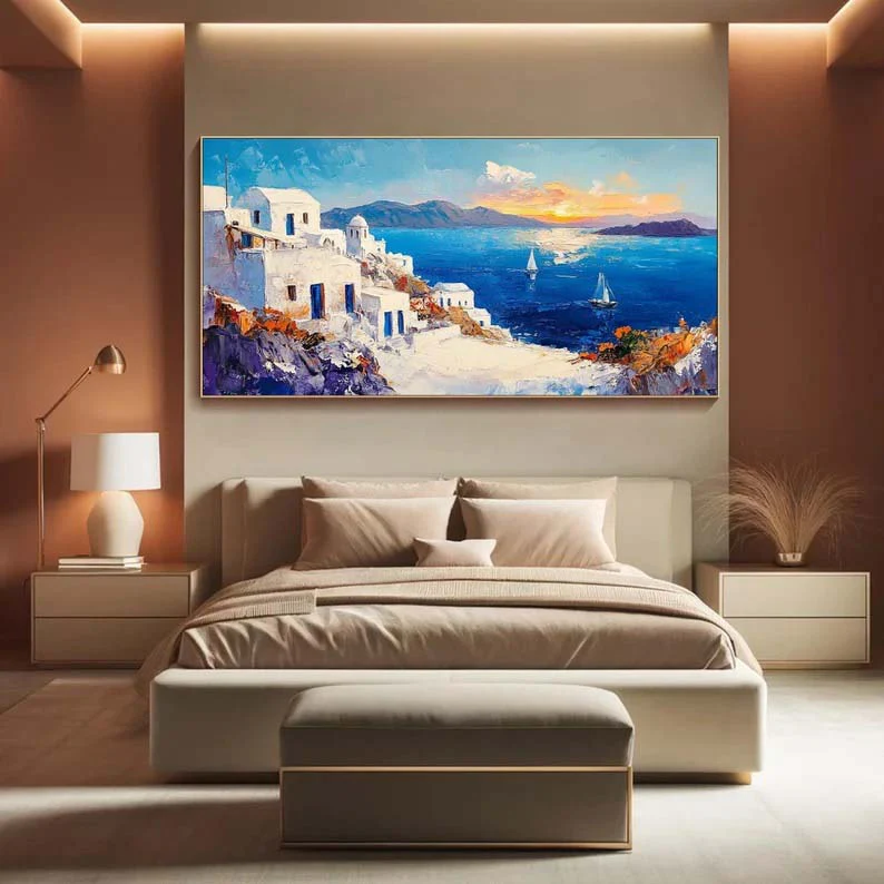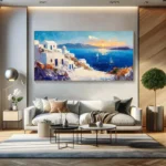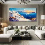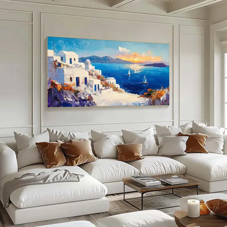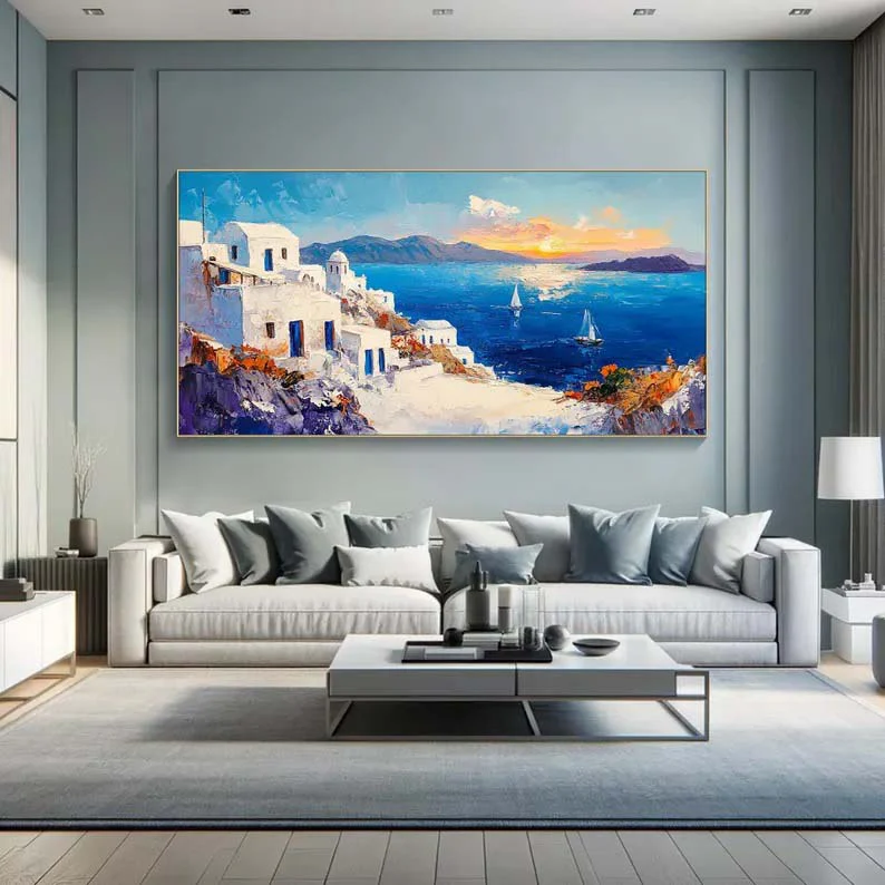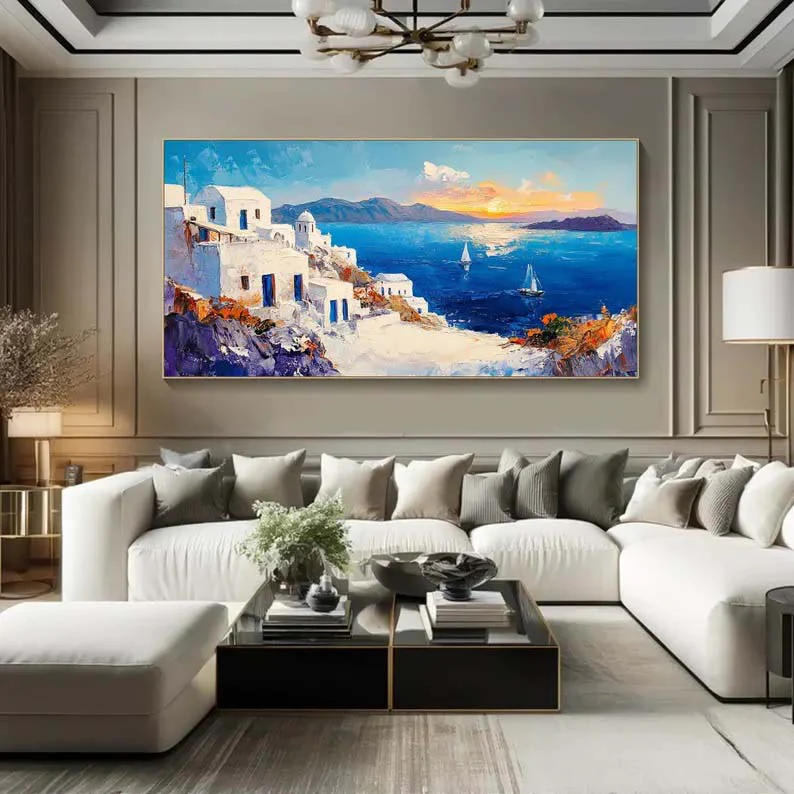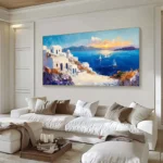 Inspired by the picturesque white buildings and beautiful blue waters, this piece Santorini will transport you right to the Greek island! With an inviting composition and lovely, vivid colors, this piece is an instant eye-catcher for any home interior!