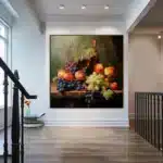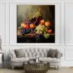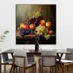 Shades of red come alive in this still life piece, where the velvety notes of Shiraz meet the lush textures of fruits. The stunning realism-style makes this piece a great addition to any home interior.