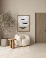 This artwork evokes the profound stillness of vessels at rest on calm waters, presented in a beautifully abstract form. The three sculptural forms drift gracefully down the canvas, creating a sense of peace, balance, and gentle movement. It is a visual poem that invites quiet reflection and brings a serene, coastal atmosphere into your home.