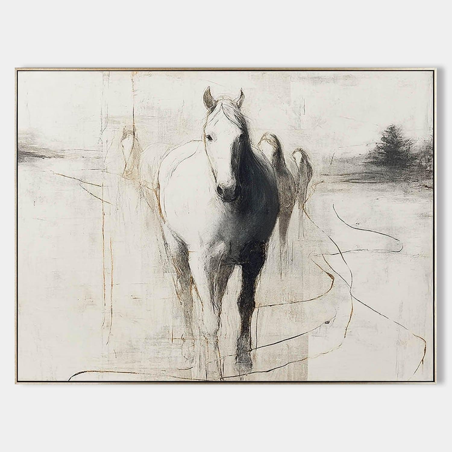 This painting is a beautiful marriage of expressive drawing and abstract painting. The central horse is rendered with soft, painterly shading that gives it a lifelike presence, while the surrounding world dissolves into a weathered, textural abstraction. Delicate, calligraphic lines of gold meander across the canvas, adding a touch of modern sophistication and defining the ethereal forms with a graceful, minimalist touch.