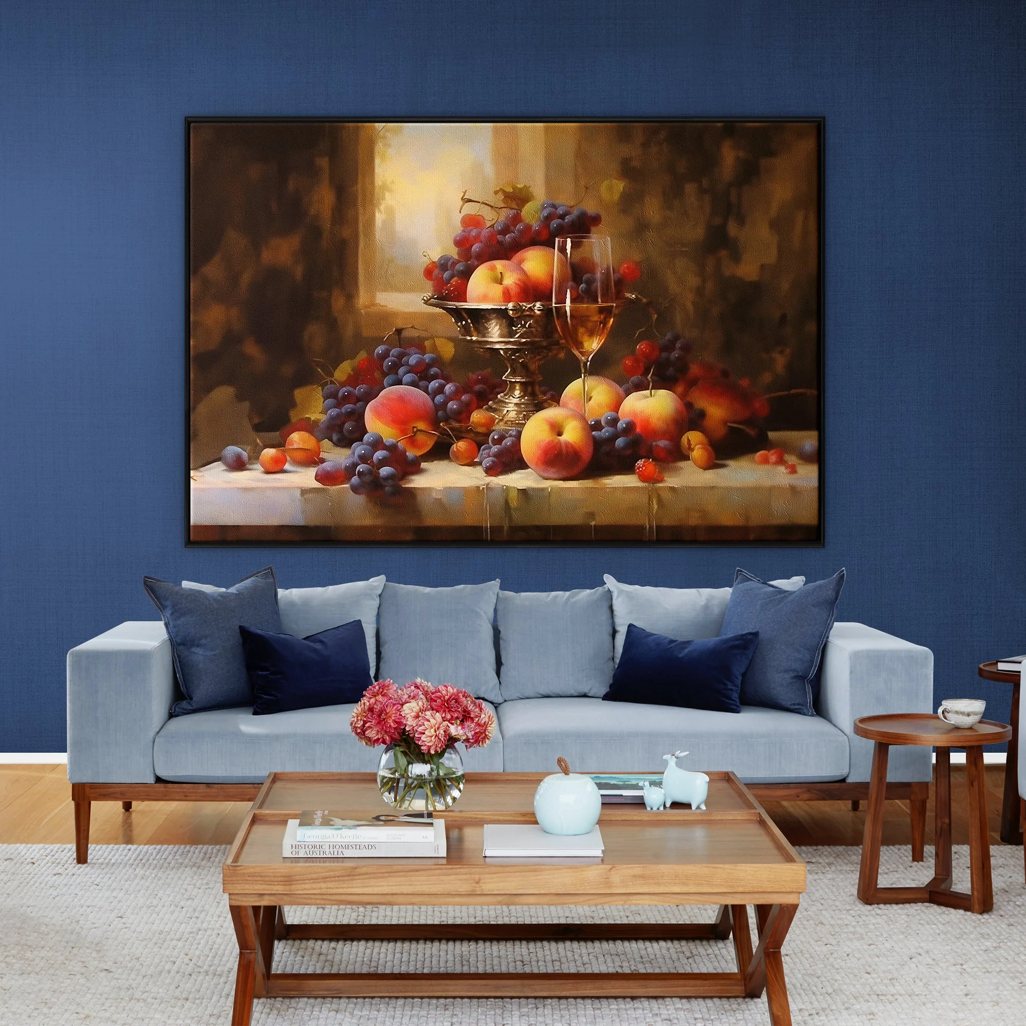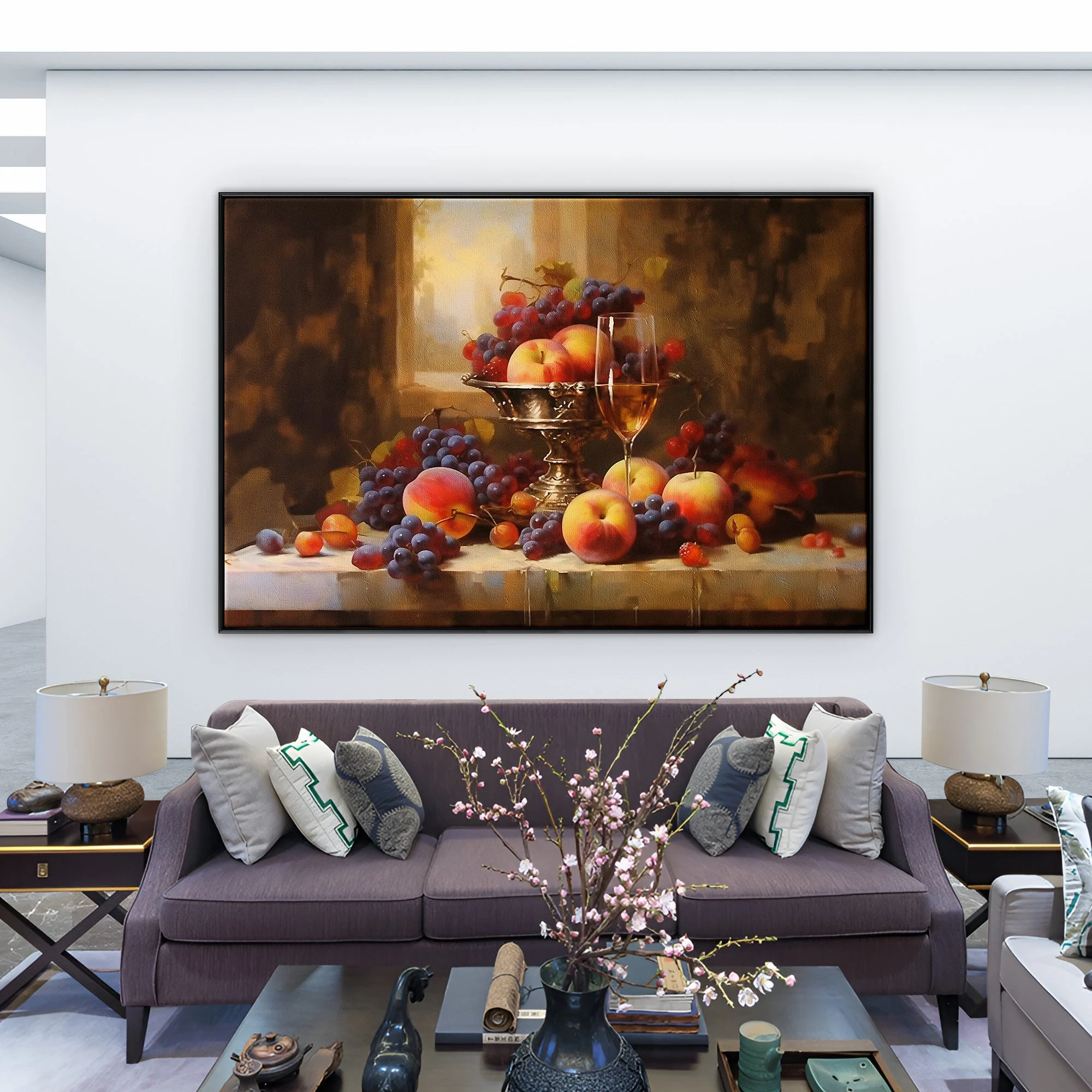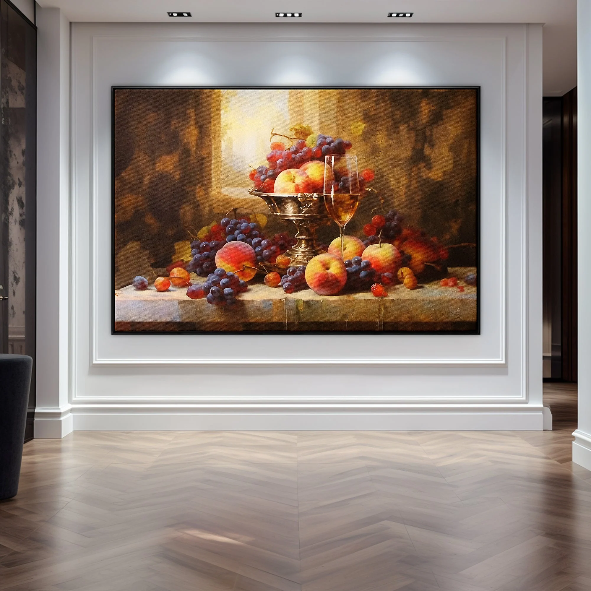 Experience elegance through this exquisite still life. The fruits seem almost edible in their lifelike presentation, making it a feast for the eyes. The stunning realism-style makes this painting a rich and sophisticated addition to any space or room.