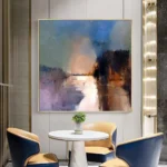 Lose yourself in this beautiful abstract sunset stream! With the use of unusual colours like purple, orange and green, the artist still managed to capture a convincing, romantic setting. The water feels like you could almost touch it, sparkling reflecting on the setting sun.