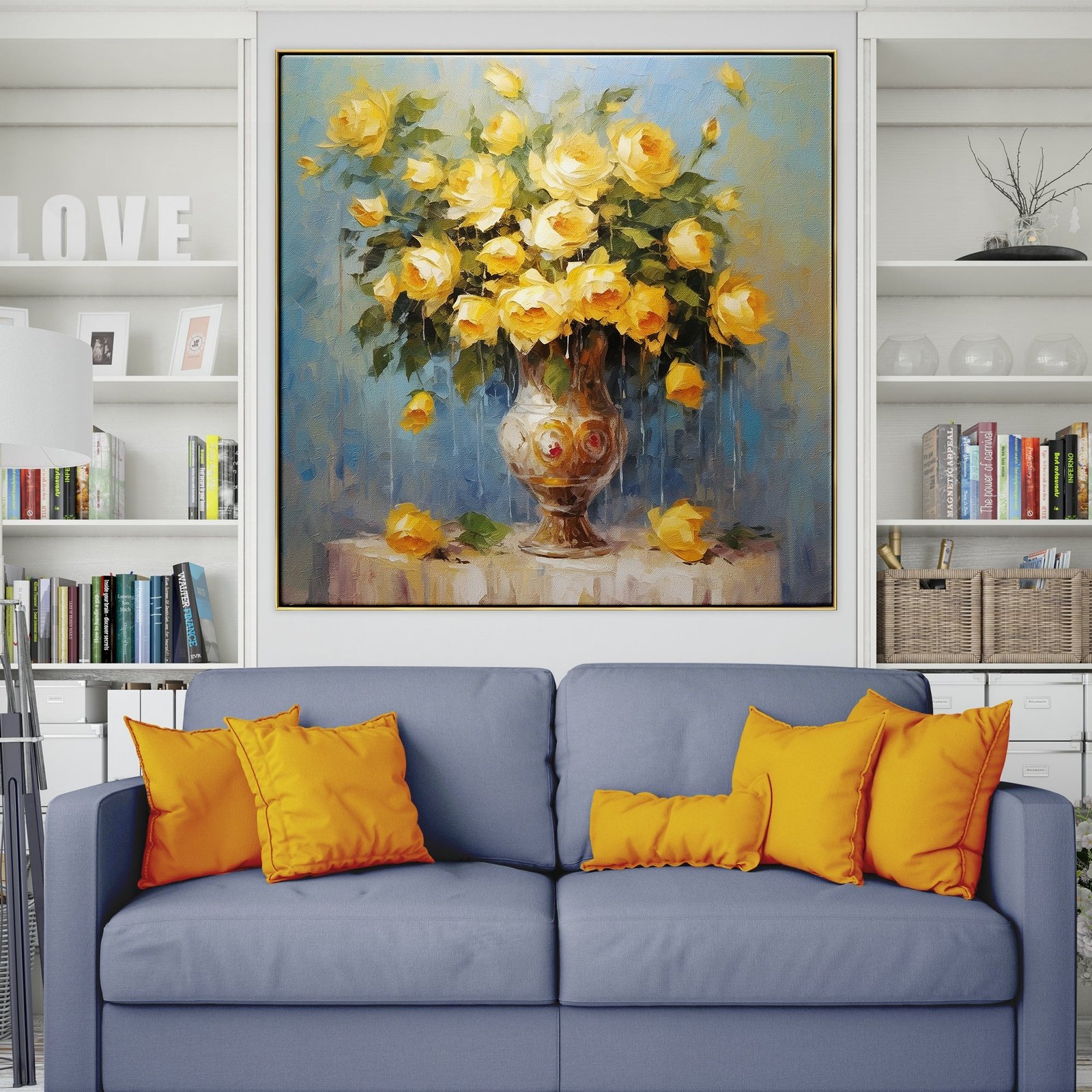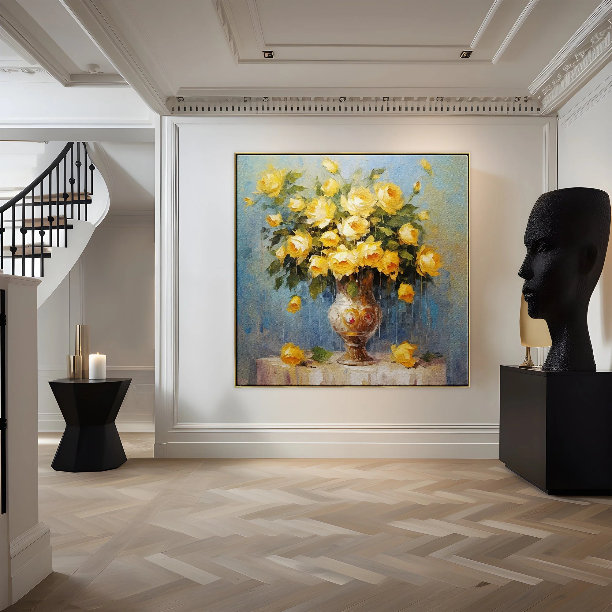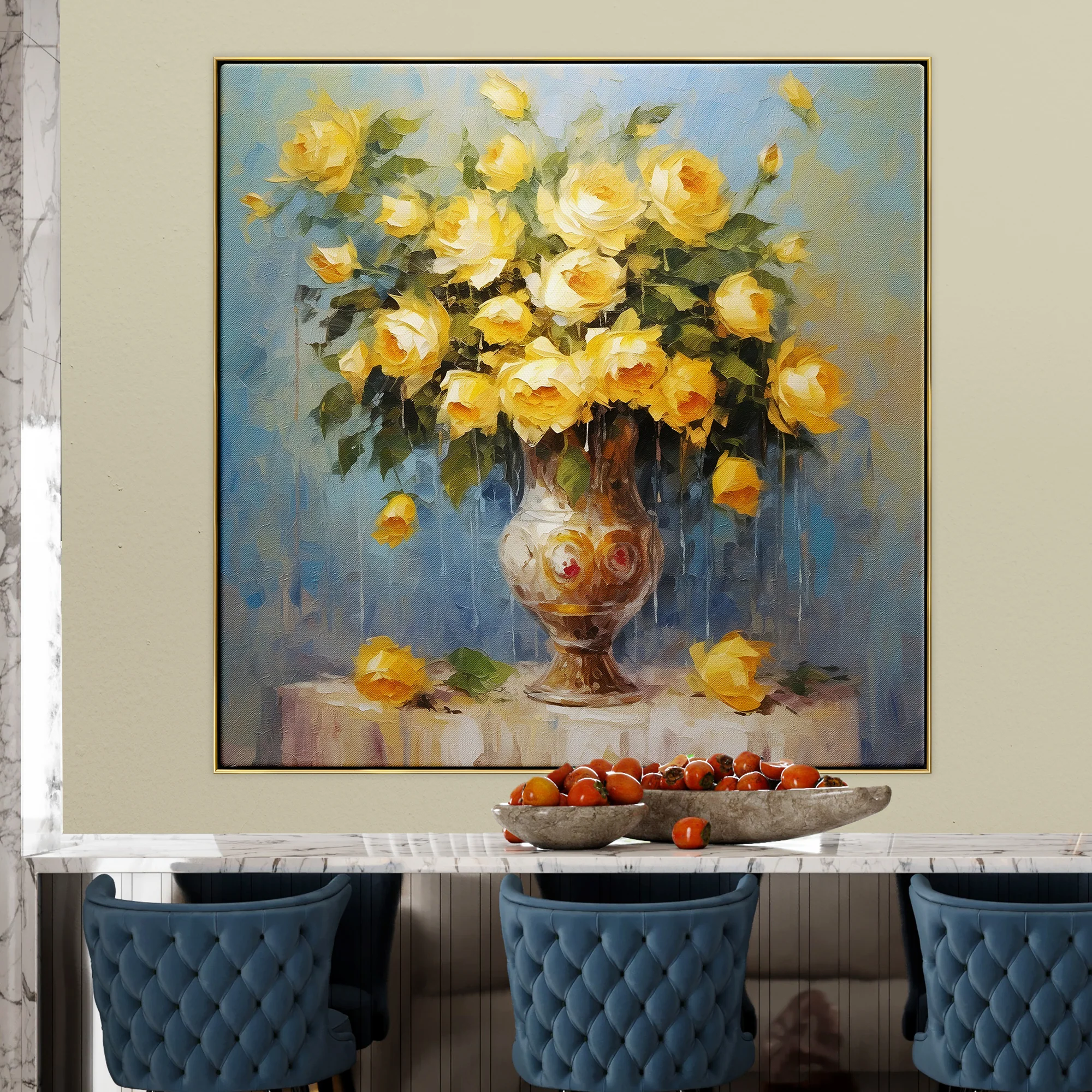 A bouquet that’s more than just flowers; it’s a splash of summer itself. Dripping and flowing, the yellow blooms seem to be in constant motion. The artwork radiates warmth and vitality.
