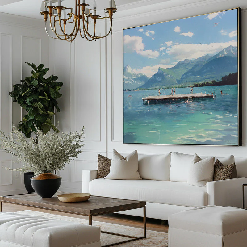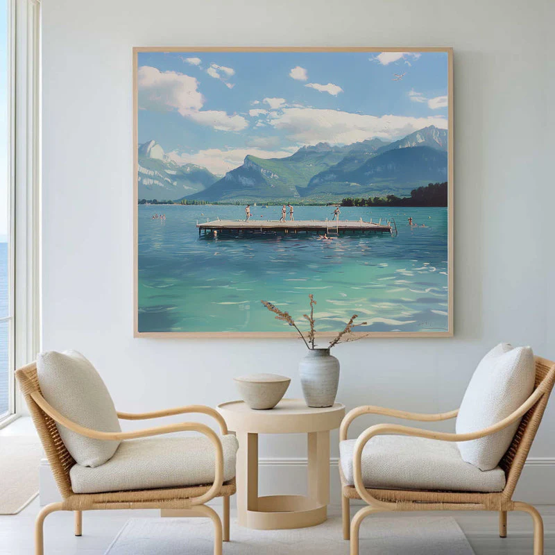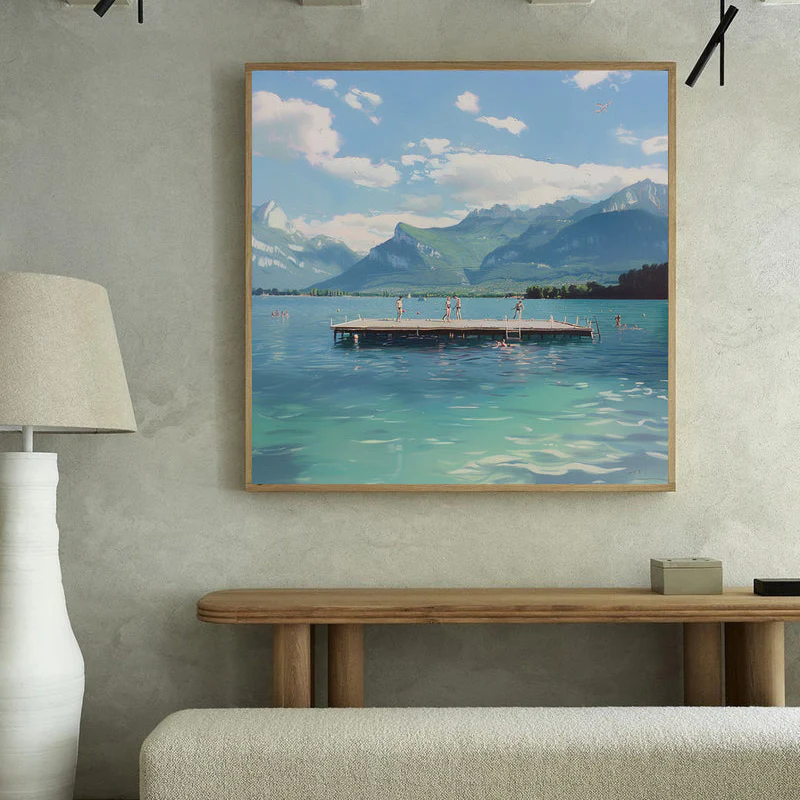 A beautiful summer lake amidst an impressive mountain range, does it get any better in life? Step into this amazing realism painting and smell the fresh breeze of nostalgia. Its fantastic details makes this painting a pleasure to look at, time and time again!