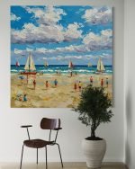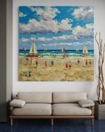 Step into the vibrant energy of a perfect summer day with “Sun-Kissed Shore.” This joyful artwork is a celebration of life at the seaside, capturing a bustling beach filled with happy people and sailboats gliding across the sparkling water. It’s a piece that radiates warmth, happiness, and a wonderful sense of nostalgia for those carefree days spent under a brilliant blue sky.