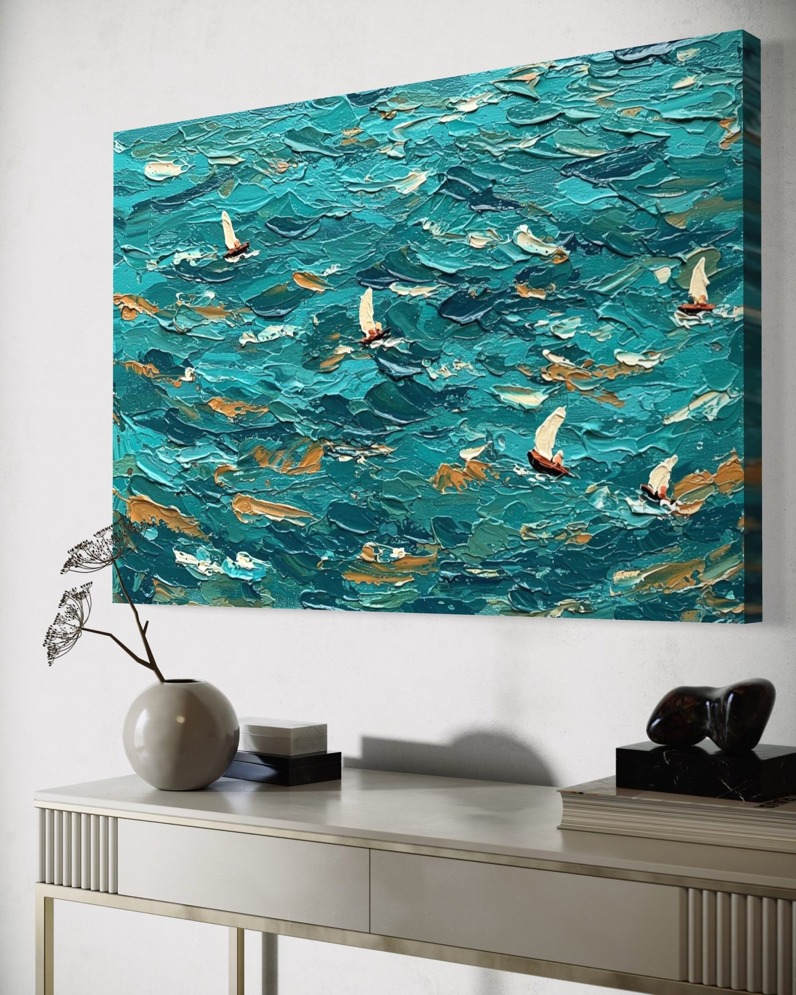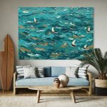 Immerse yourself in the breathtaking expanse of the open sea with “The Azure Fleet.” This magnificent artwork is not just a painting but a sculptural landscape of the ocean’s surface, capturing the energy of the waves and the freedom of sailboats on a breezy day. It is a tribute to the spirit of adventure and the raw, untamed beauty of the sea, a piece that brings a dynamic and invigorating presence to your space.