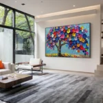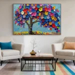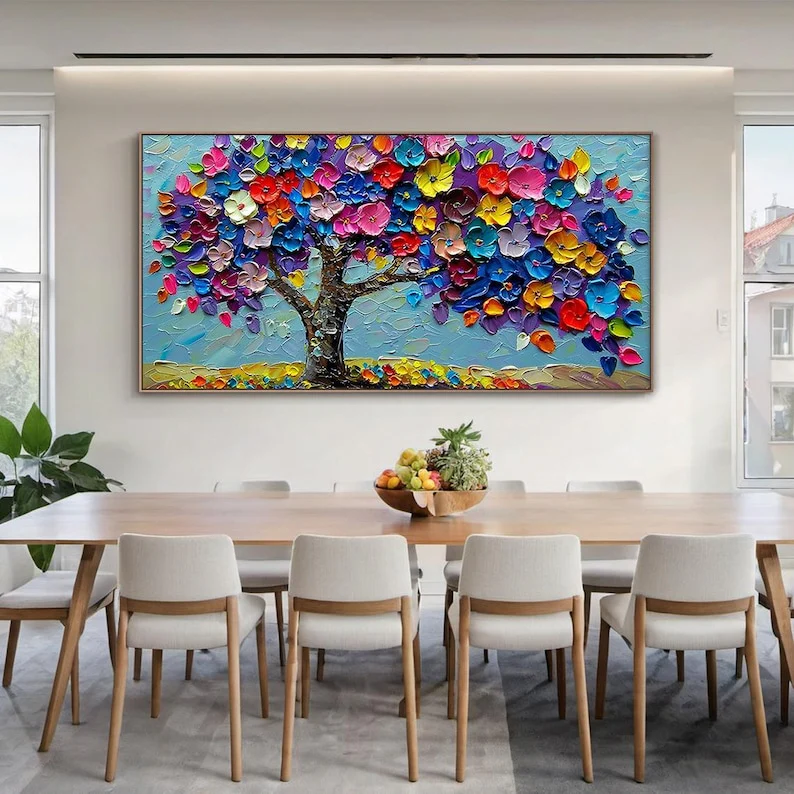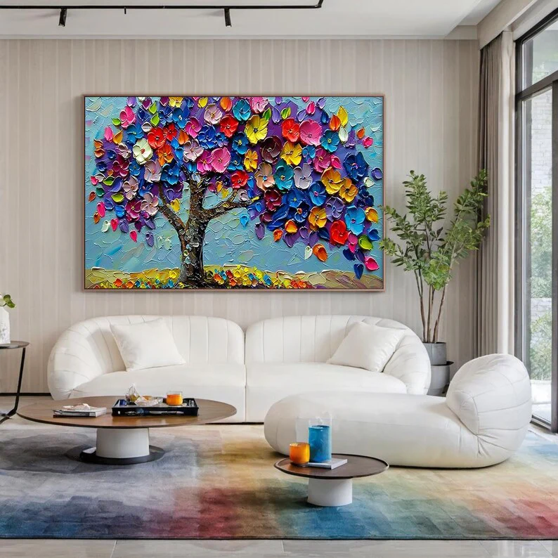In this vibrant artwork, each leaf feels alive with paint. The blossoms range from deep blue colors to sunny yellow, all meeting under a soft sky. This piece is bound to put a smile on your face, no matter where it is portrayed!