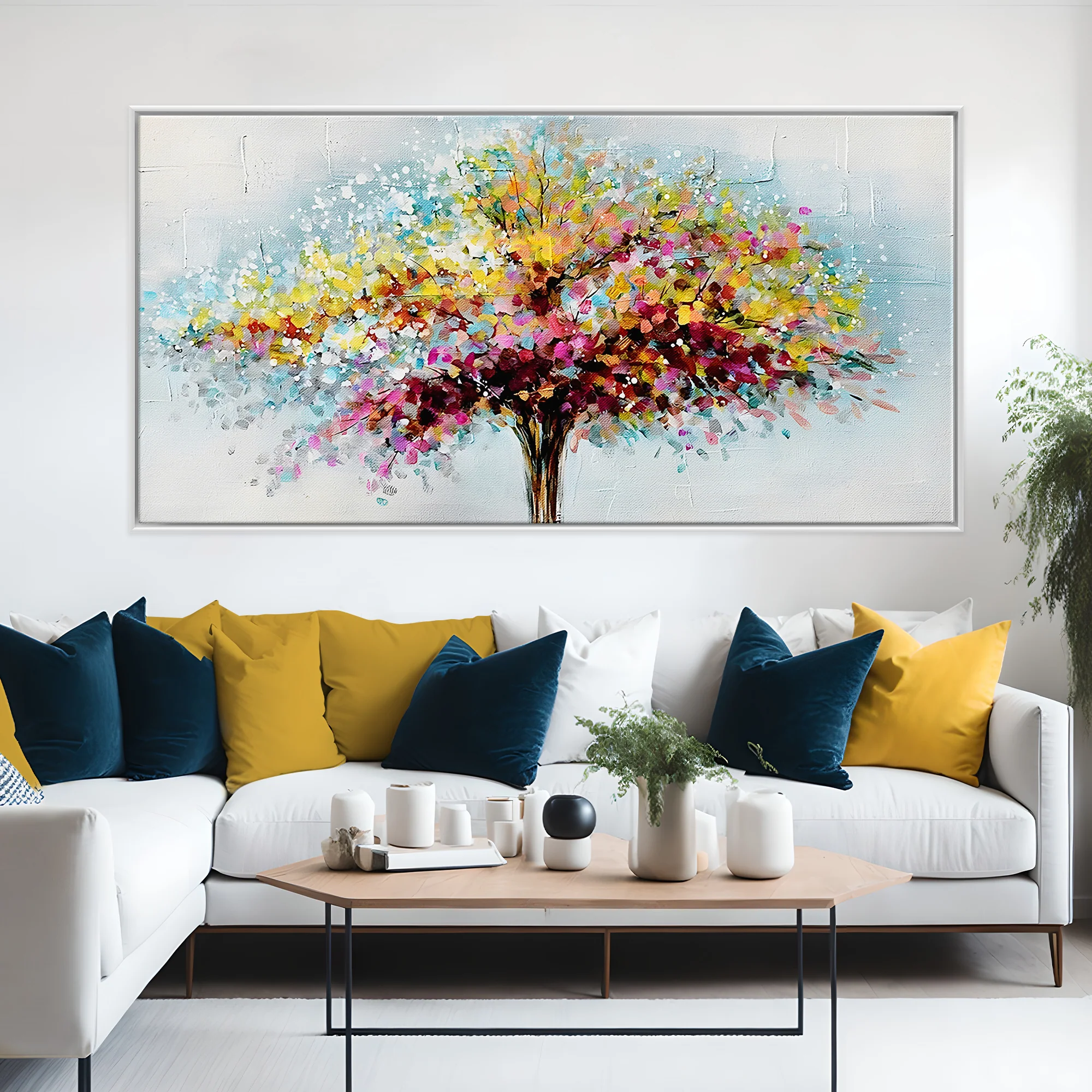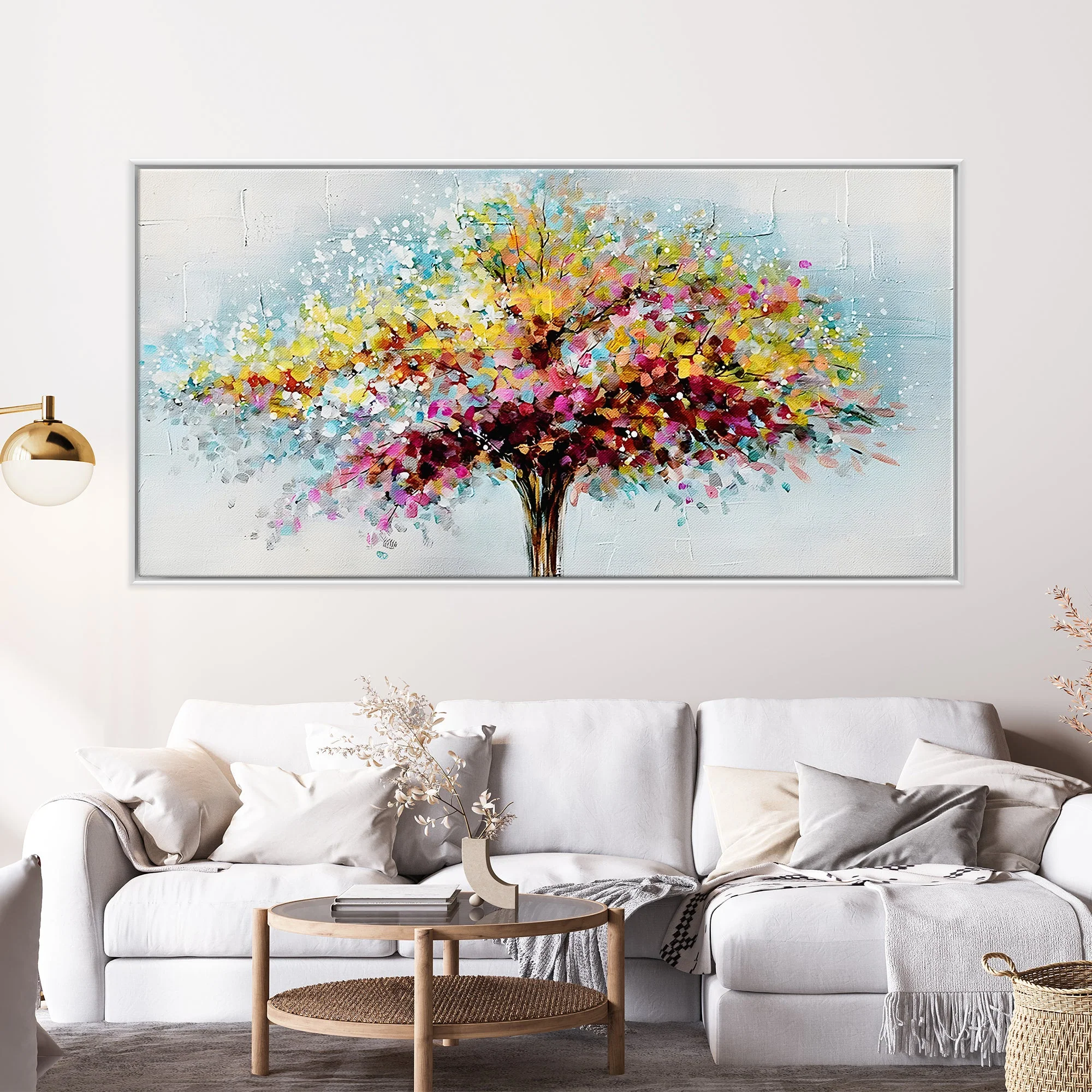 With a unique dot-style of painting, this colorful piece combines nature with the cosmos in a spectecular way! The painting technique gives this piece a lot of texture, making it a great addition to any home interior!
