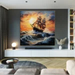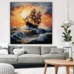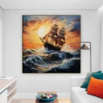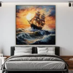 A magnificent sailing ship in turbulent waters, bathed in the golden glow of the setting sun. The Eurydice invies you to embark on an adventure that leads you into the beauty of twilight.