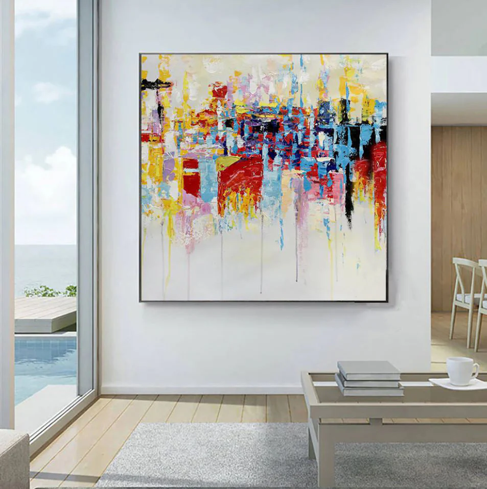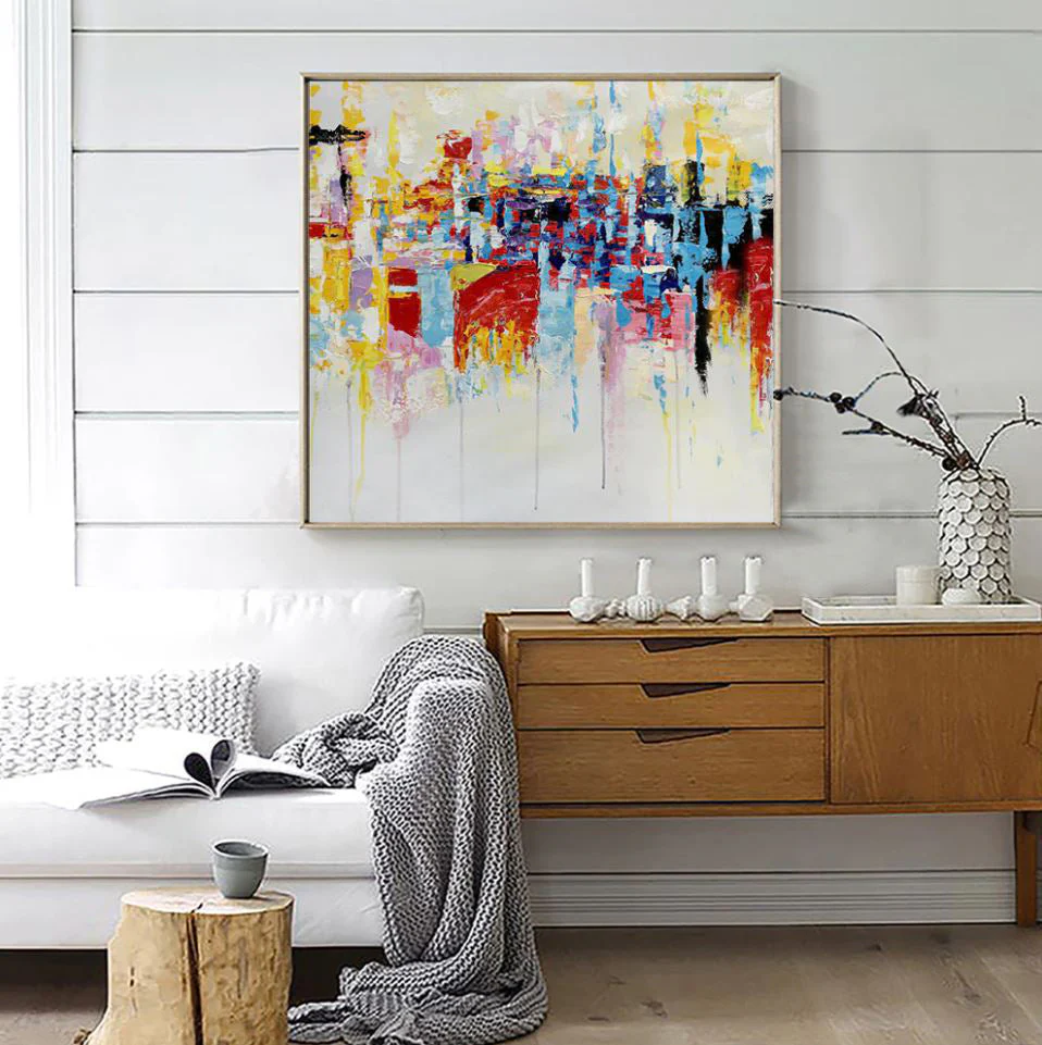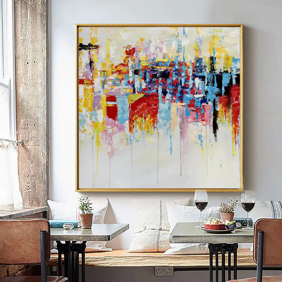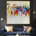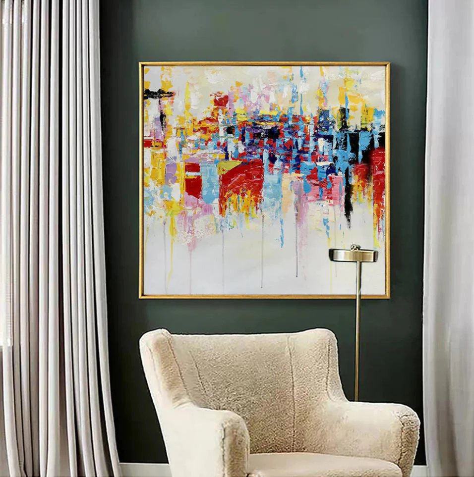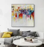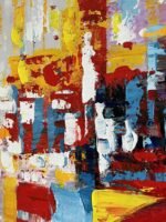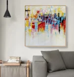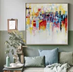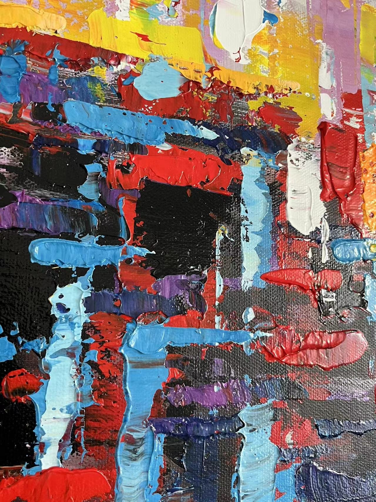 This colorful artwork ‘The Good Place’ is a vivid collection of colors all blending beautifully in an abstract and dynamic composition. It portrays a place free of any crime, sadness, or trouble: a place where life is good and people prosper.