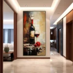 This art piece portrays a wine bottle and glass with a touch of impressionism. Each brushstroke captures the essence of a wine’s journey from vineyard to glass in a burst of color.