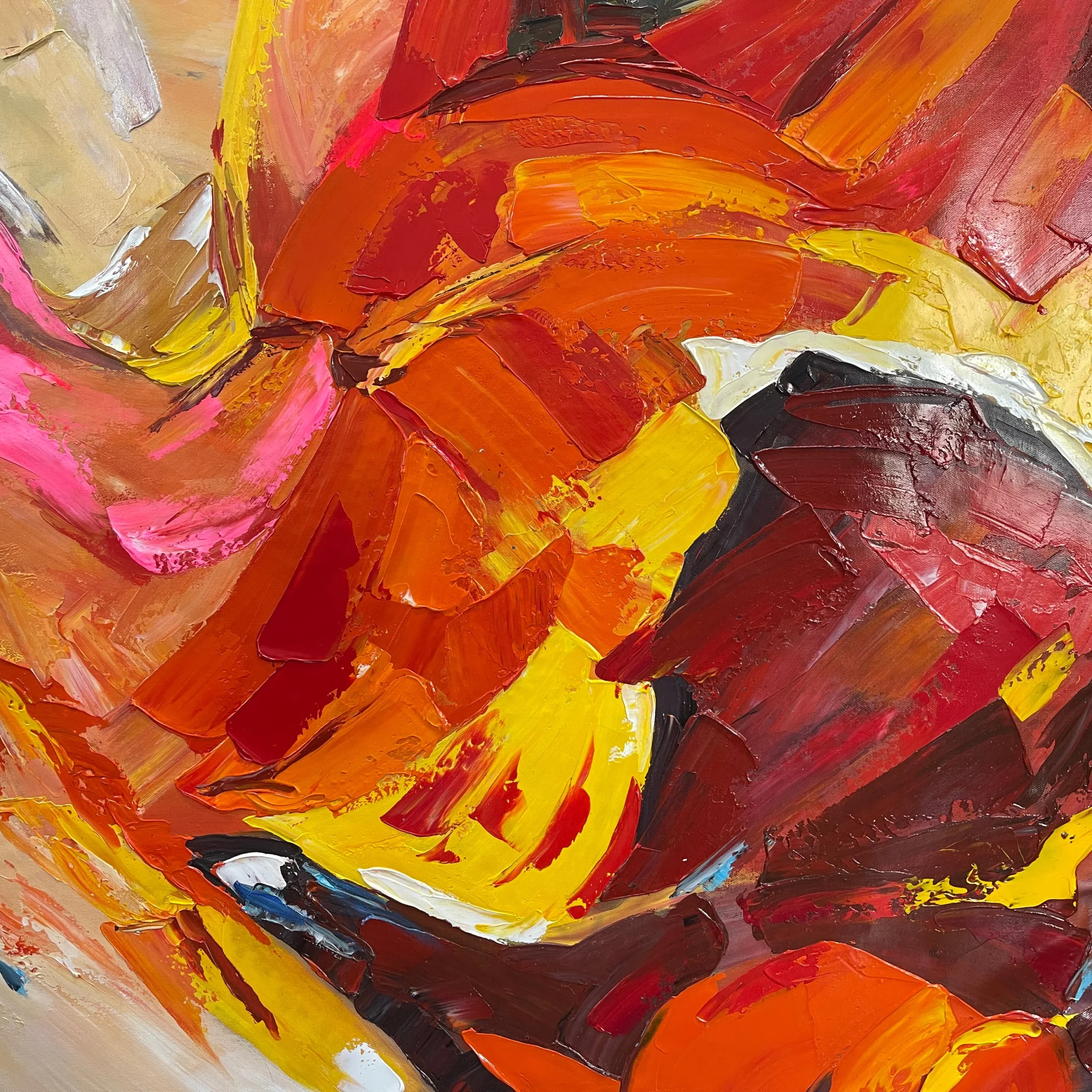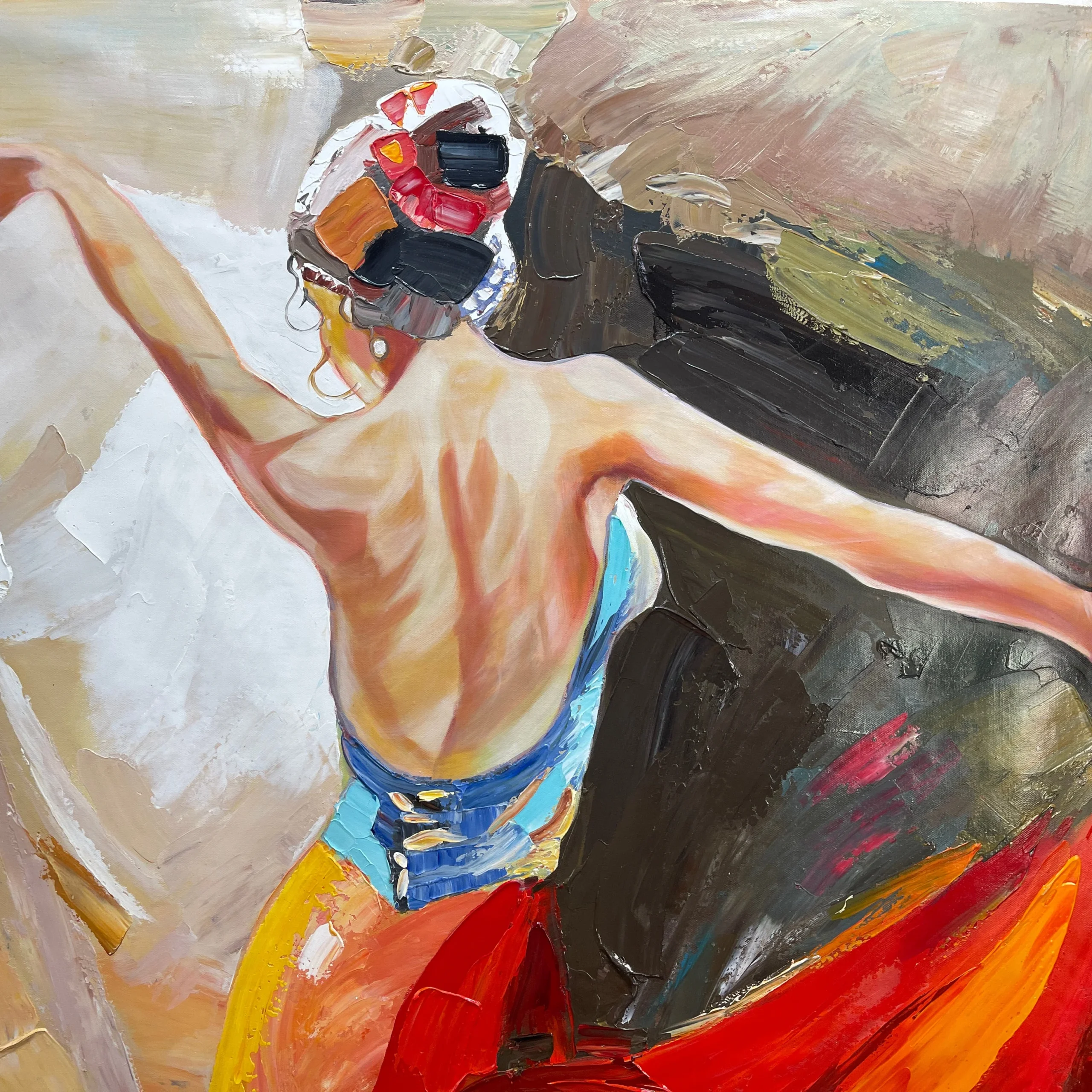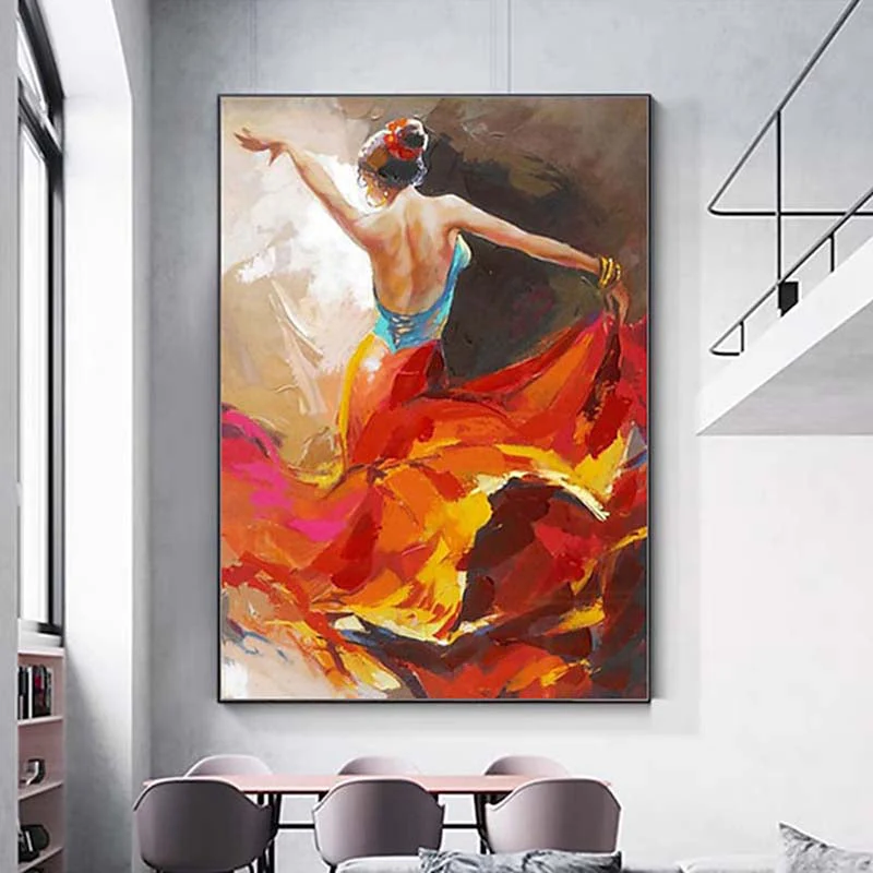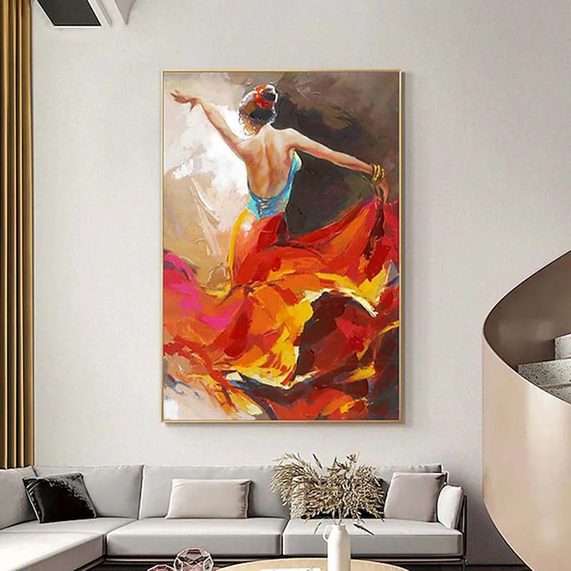 Feel the passion and grace in this stunning painting, where a dancer’s fluid motion is beautifully captured in vivid red and orange colors. It’s a piece that will bring warmth and energy to your space.