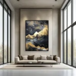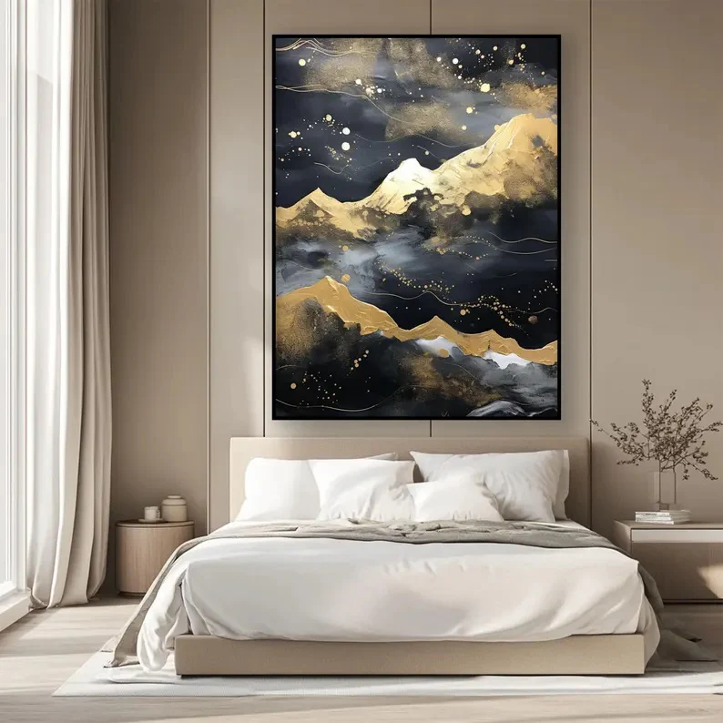 There is something mystique about this stunning mountain range. With golden accents and swirls and a mysterious fog covering the peaks, this piece adds a lot of character to any modern home interior!
