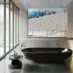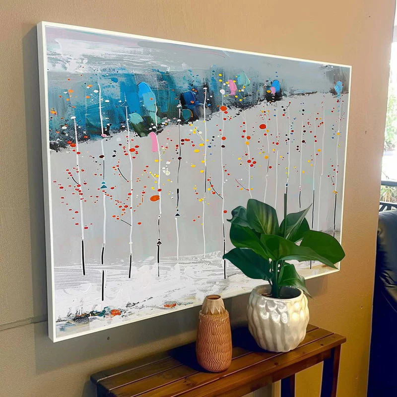 Bring a breeze of personality into your space with The Skinny Trees. The tall white trunks feel light and airy, while the surprise of floating colors adds life and vibrancy. It’s a unique composition, suited for any home interior!
