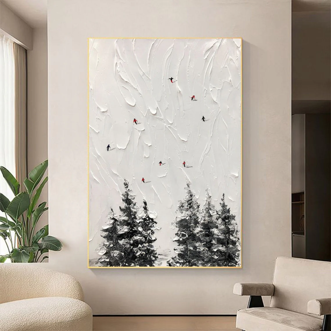 The Steep Slopes captures the thrill of winter adventure! The funny, tiny skiers zigzag across a textured snowy canvas, bringing energy and charm to your walls. This piece will add movement and joy to any space and is perfect for people who love winter sports!