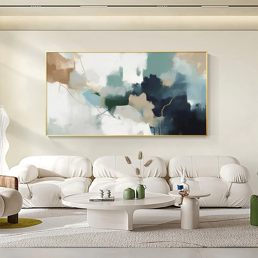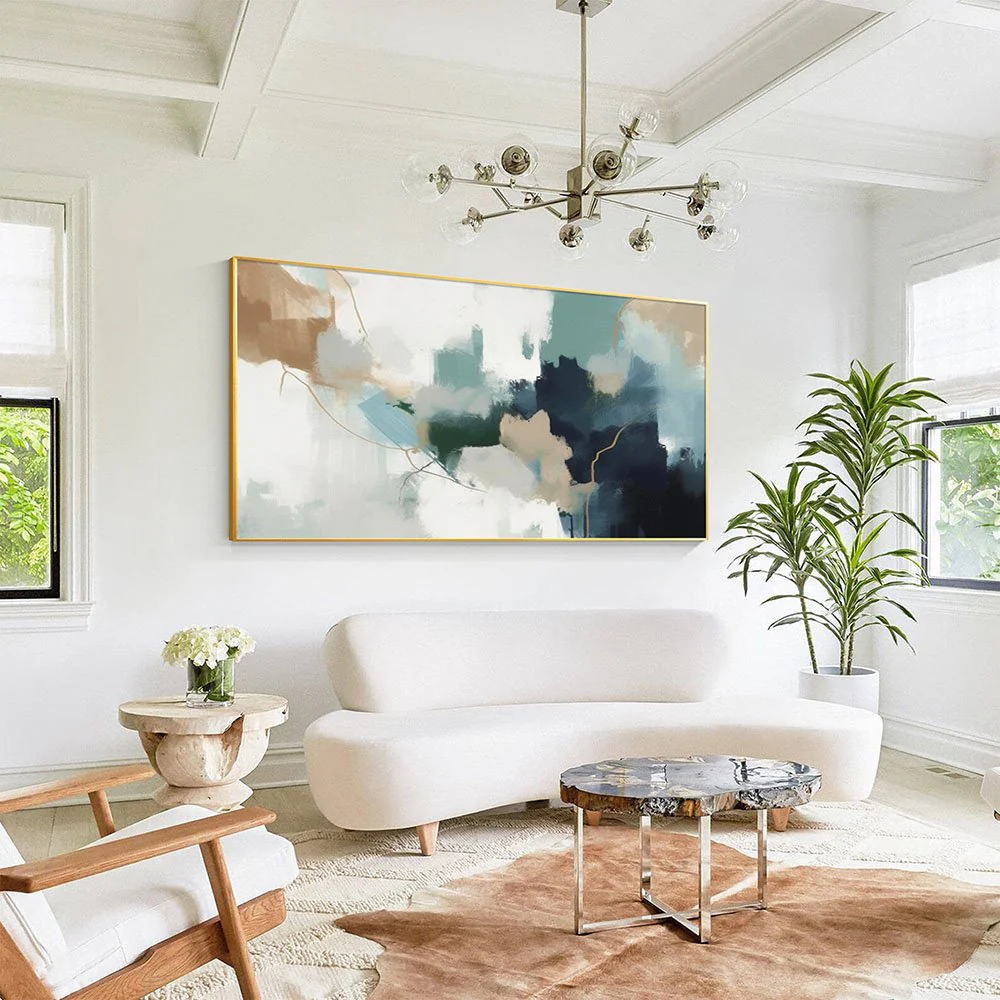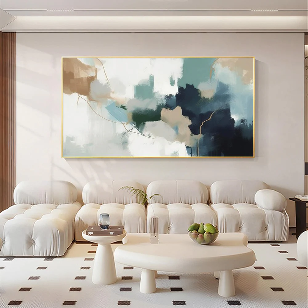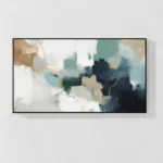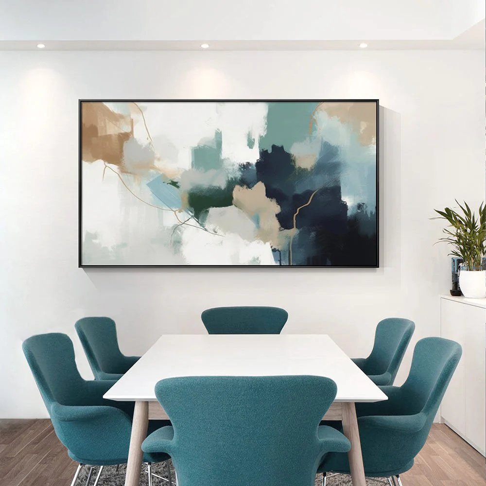 Umbrage feels like stepping out of bright light into cool shade. Muted colors blend softly, creating a calm abstract landscape. The darker tones give depth and comfort, adding a lot of balance and a feeling of gentle protection to your interior!