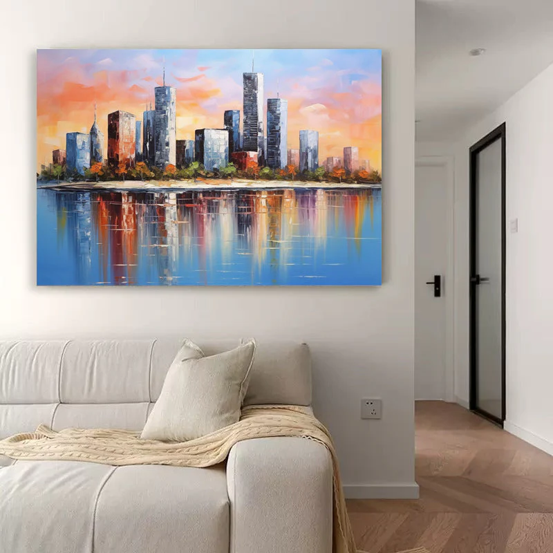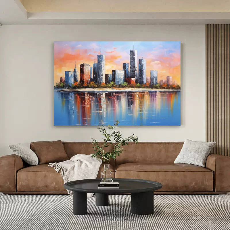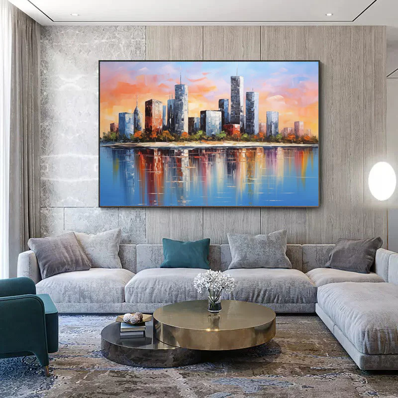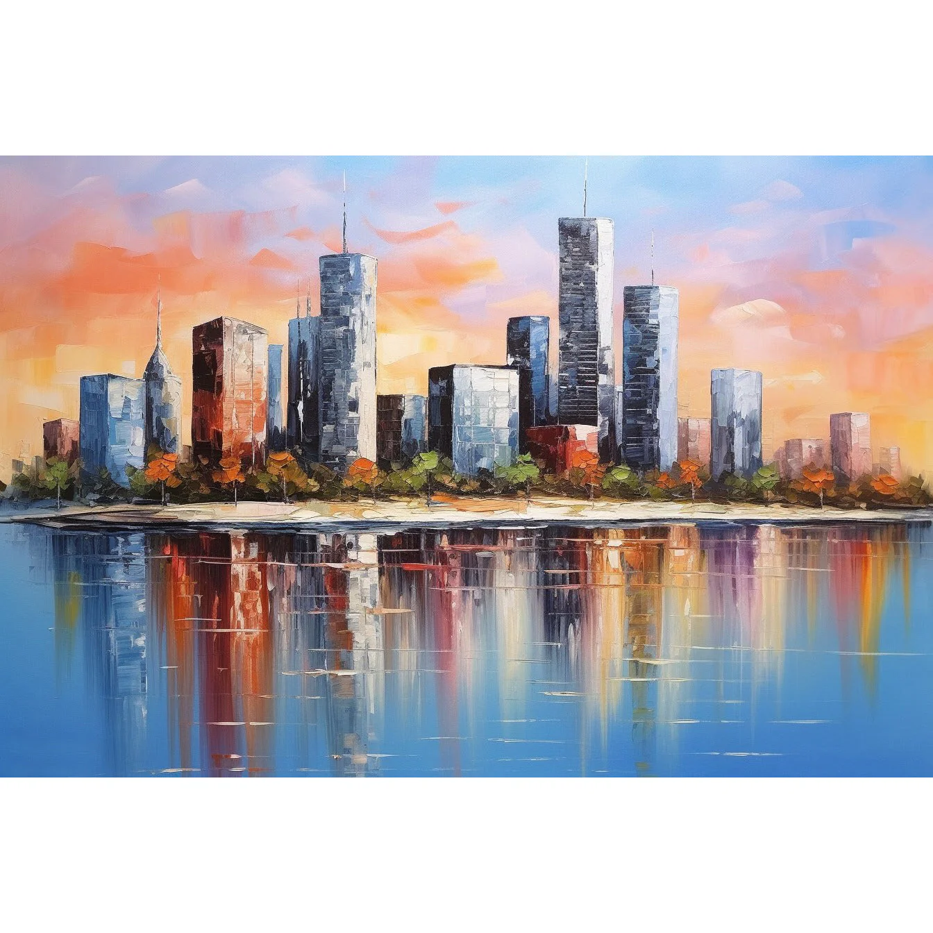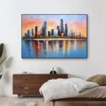 Some cities are unforgettable, and this painting brings that feeling home. With skyscrapers standing tall and the sky melting into the water, it’s a piece that speaks to dreamers, doers, and anyone who loves a stunning city skyline!