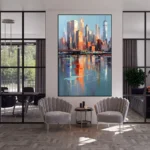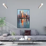 Urban Serenity shows a busy city slowing down for a quiet moment. Soft blue colors and warm orange tones reflect in calm water, making the city feel alive but peaceful. This painting brings balance, comfort and a gentle calm that makes you breathe deeper when you look at it.