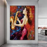 Immerse yourself in the rhythm of Velvet Funk. This striking painting features a saxophonist in full flow, surrounded by a vibrant mix of colors, bringing energy and life to your décor.