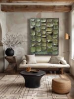 “Veridian Mosaic” is a hand-painted artwork that offers a profound connection to nature through texture and color. This piece is a tranquil meditation, evoking the feeling of a path of moss-covered stones or an ancient, weathered wall reclaimed by nature. Its rhythmic composition and deep, earthy greens create a calming atmosphere, perfectly embodying the Wabi Sabi appreciation for organic beauty and imperfection.