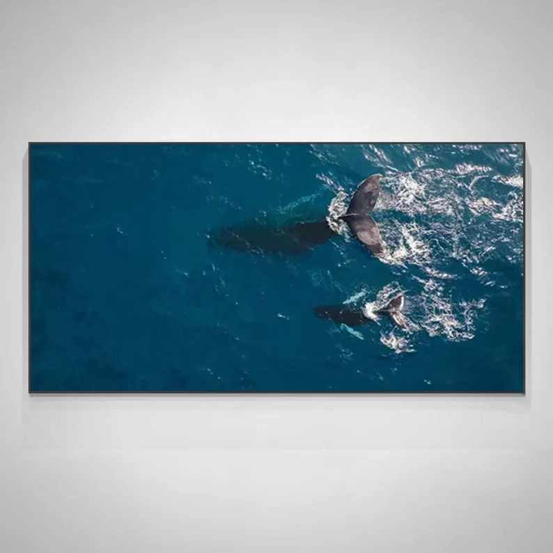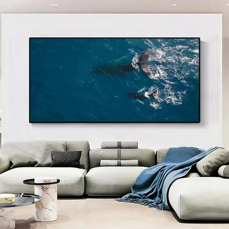 Wandering Whales is a celebration of freedom and grace. This stunning artwork captures the beauty of these majestic creatures exploring the endless ocean, creating a serene and captivating centerpiece.’