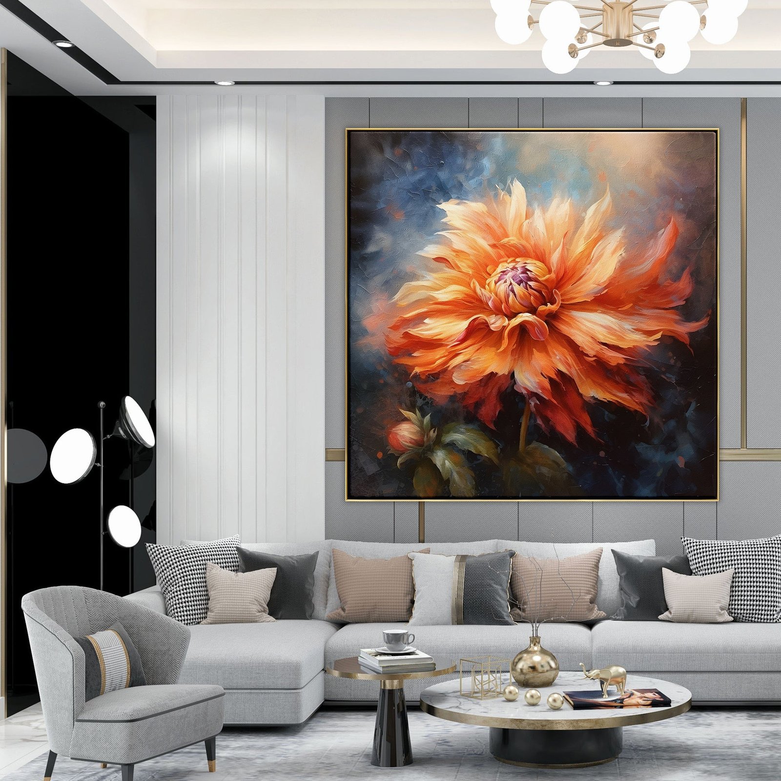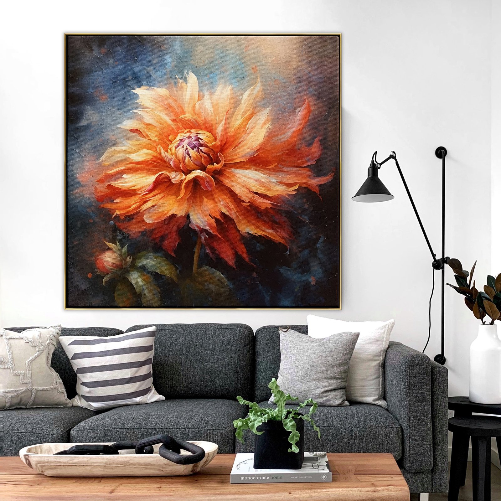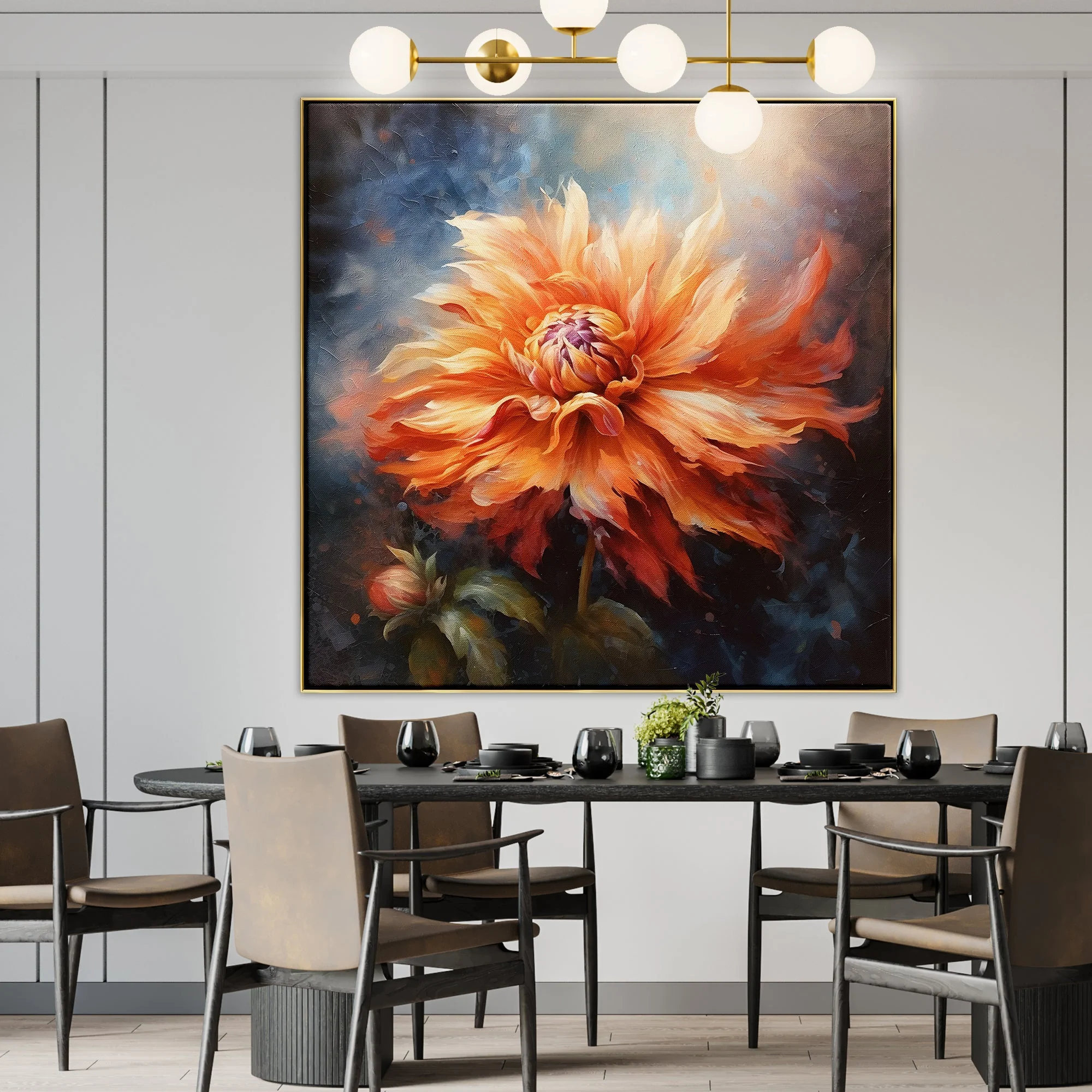 A beautiful orange flower blossoms into the warming sunrays of the coming of Spring. The amazing details and a stunning realism-style add sophistication and class to any space or or room.