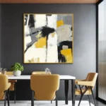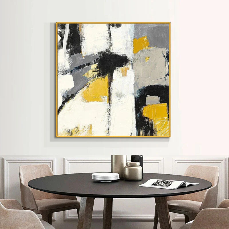 We have a big passion for art and want to show that enthusiasm with this modern abstract artwork! The graceful yellow patches of paint contrast beautifully with the grey and black patches, creating an aesthetically pleasing piece, suited for many interiors!